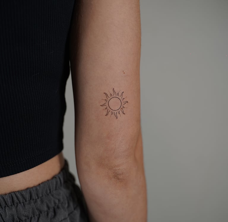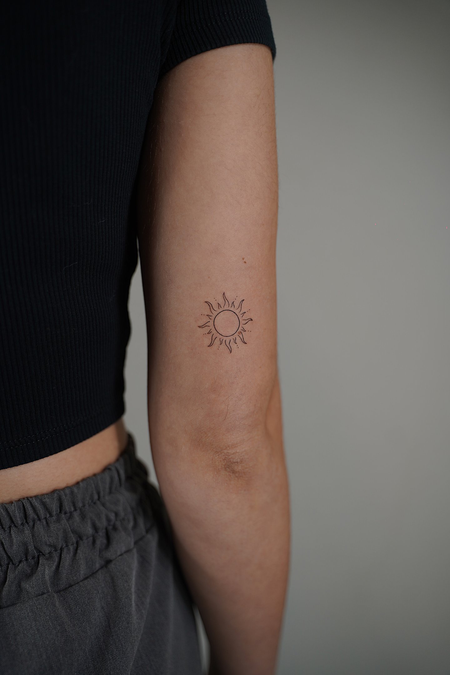 Un sol situado encima del codo, de tamaño mediano, con un diseño de rayos diferente a los clásicos lineales. La estructura es más visual y distintiva, lo que lo convierte en un símbolo sencillo pero con personalidad. Los tatuajes de sol en línea fina siguen siendo una elección muy versátil y atemporal.