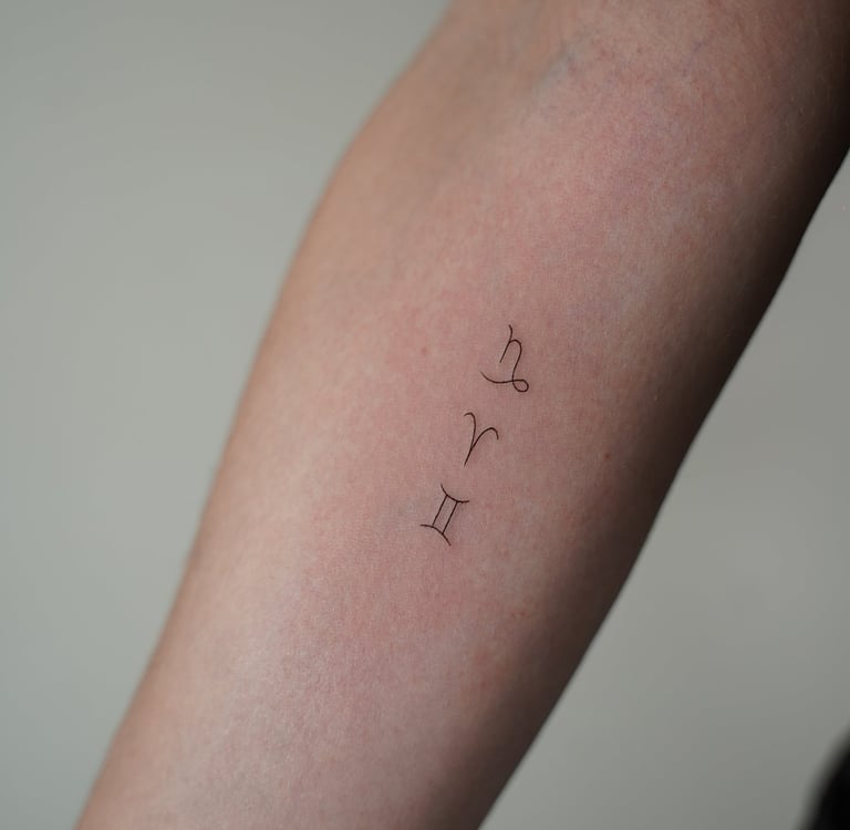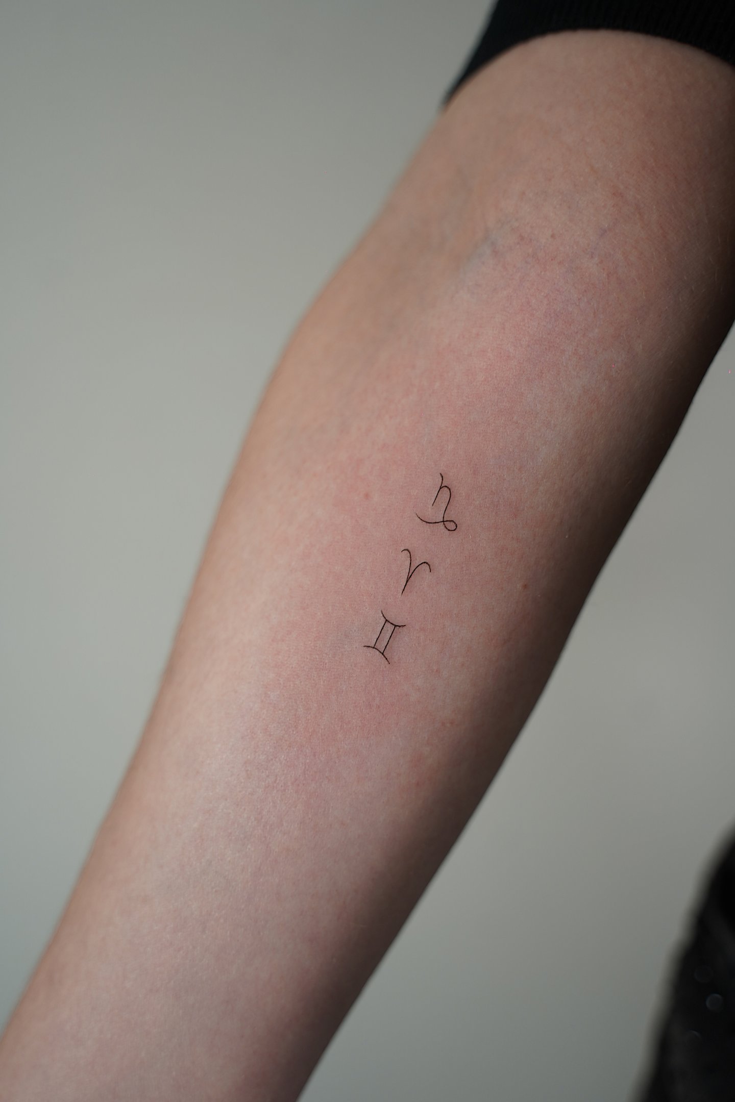 Tres símbolos del zodiaco realizados en línea fina y colocados en vertical. Cada uno representa a una persona especial, creando una composición elegante y muy personal. Este tipo de tatuajes fineline en vertical funcionan especialmente bien en el brazo porque estilizan la zona.