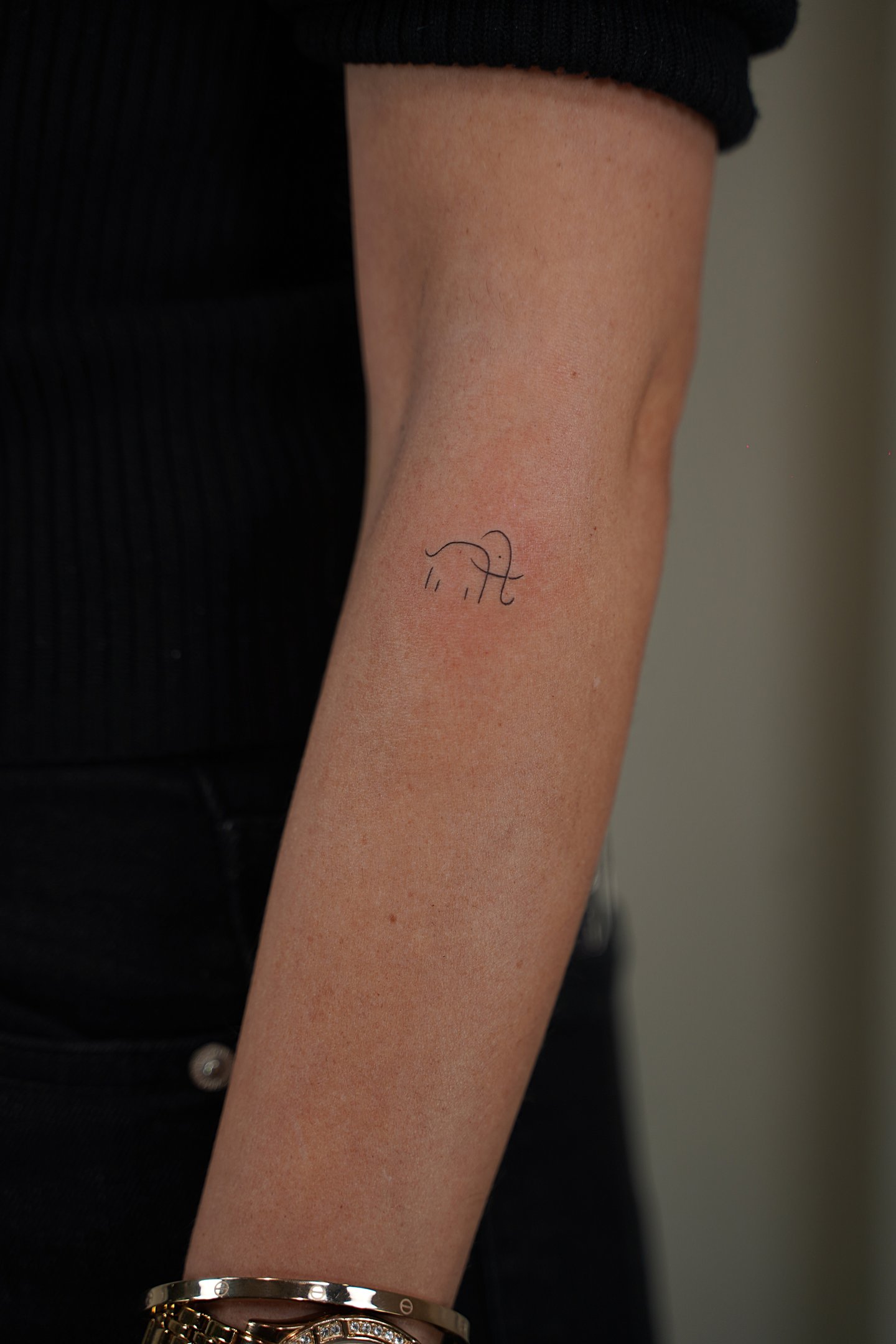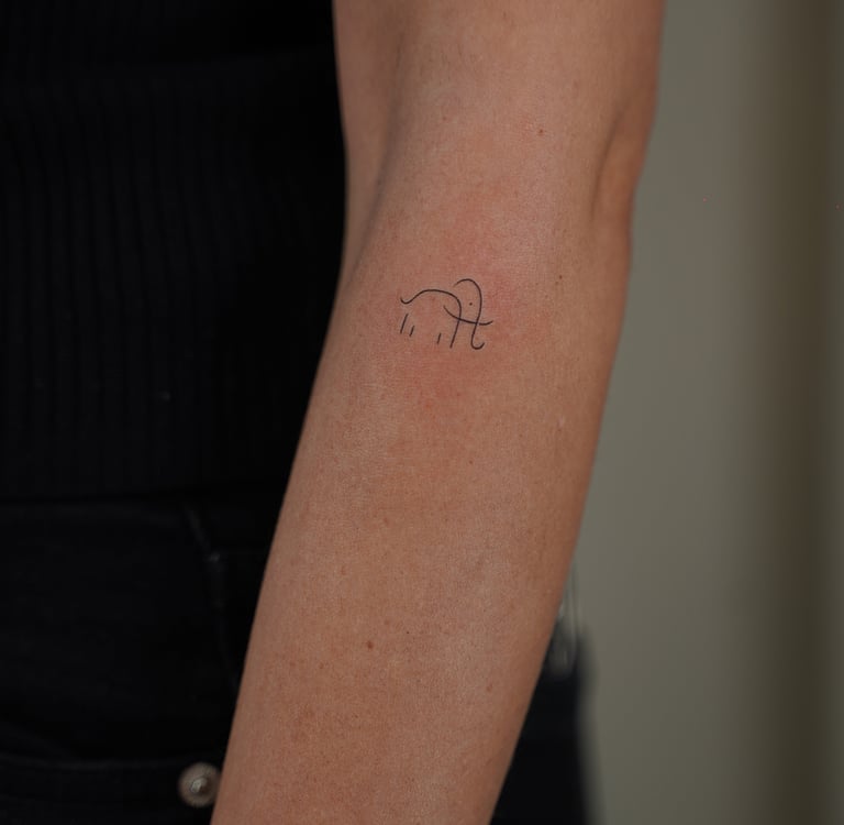 Un elefante trabajado de forma abstracta y muy simple, ubicado en una zona del brazo ligeramente fuera de lo común. Este tipo de tatuajes fineline funcionan muy bien cuando se busca representar fuerza y sabiduría sin necesidad de añadir exceso de detalle. La colocación estratégica hace que el diseño destaque sin resultar evidente.