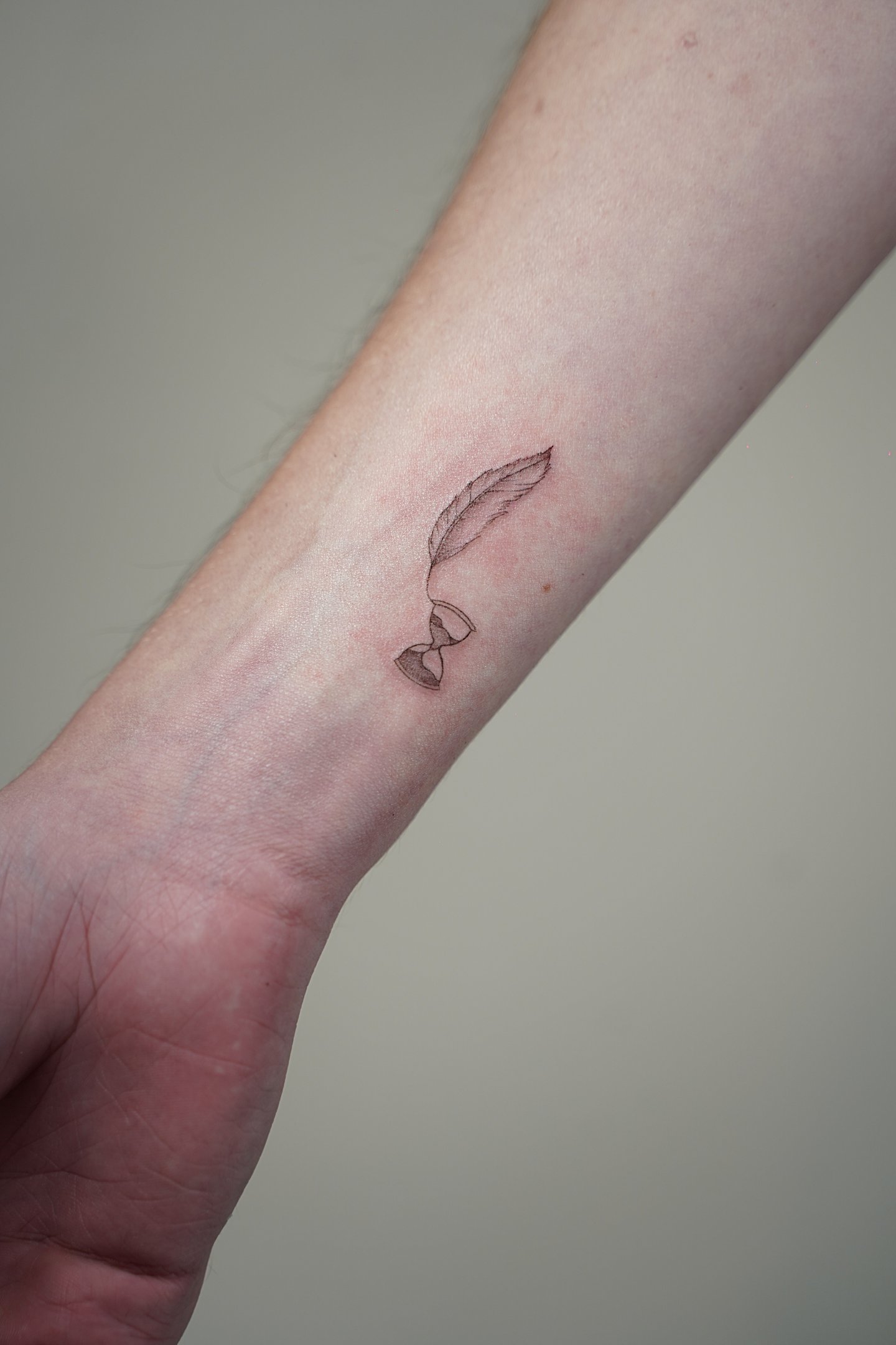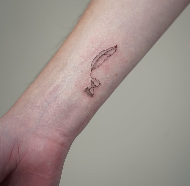 Un reloj de arena del que emerge una pluma, creando una composición simbólica muy interesante. Puede interpretarse como el paso del tiempo unido a la creatividad, la escritura o la libertad. Es un diseño más elaborado dentro del fineline, pero mantiene ligereza y equilibrio visual.