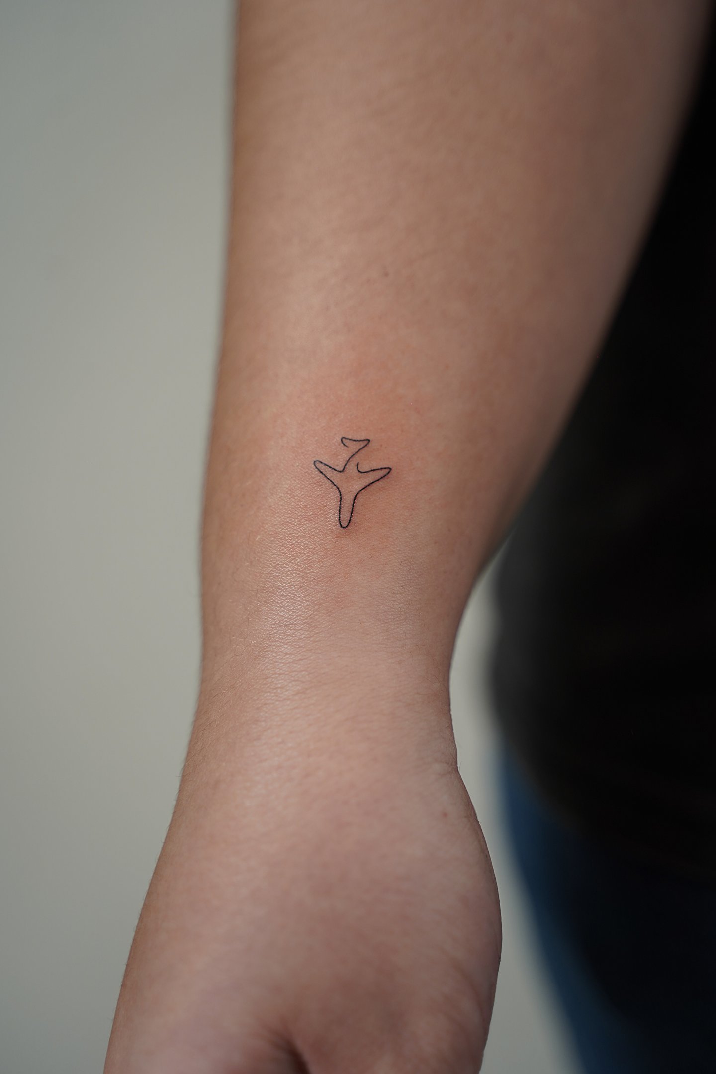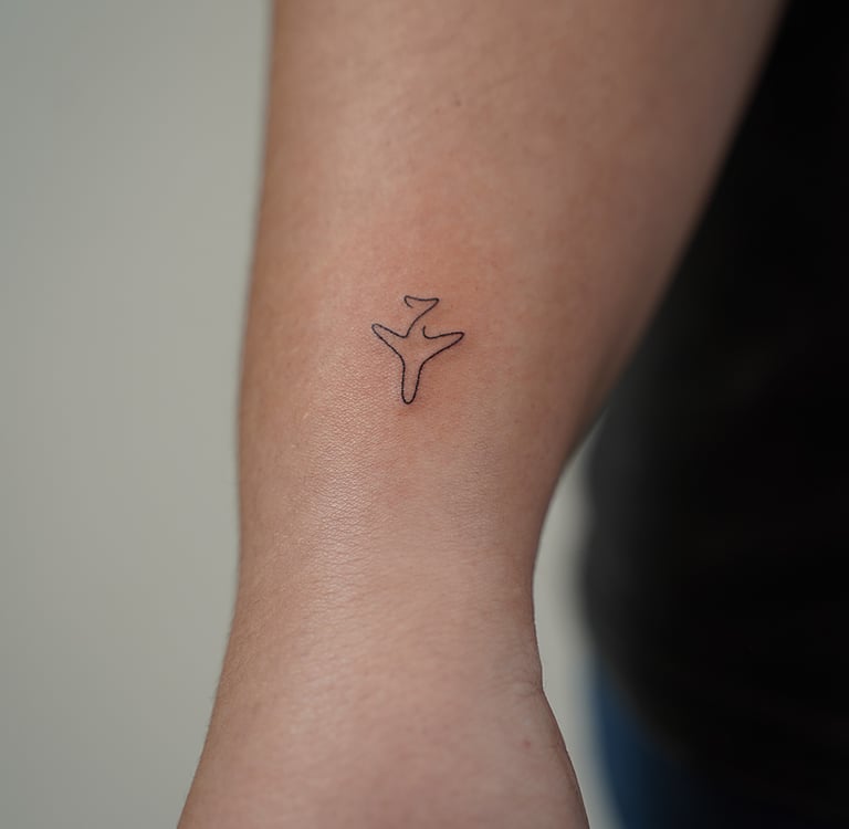 Un avión trabajado con un trazo simple, casi en estilo one line, pero dejando el diseño ligeramente incompleto. Esa pequeña interrupción en la línea le aporta un toque moderno y más conceptual. Es un tatuaje pequeño y delicado que simboliza viaje, libertad y movimiento.