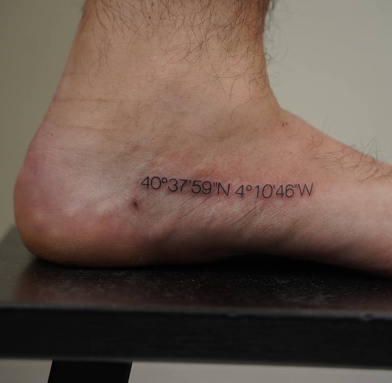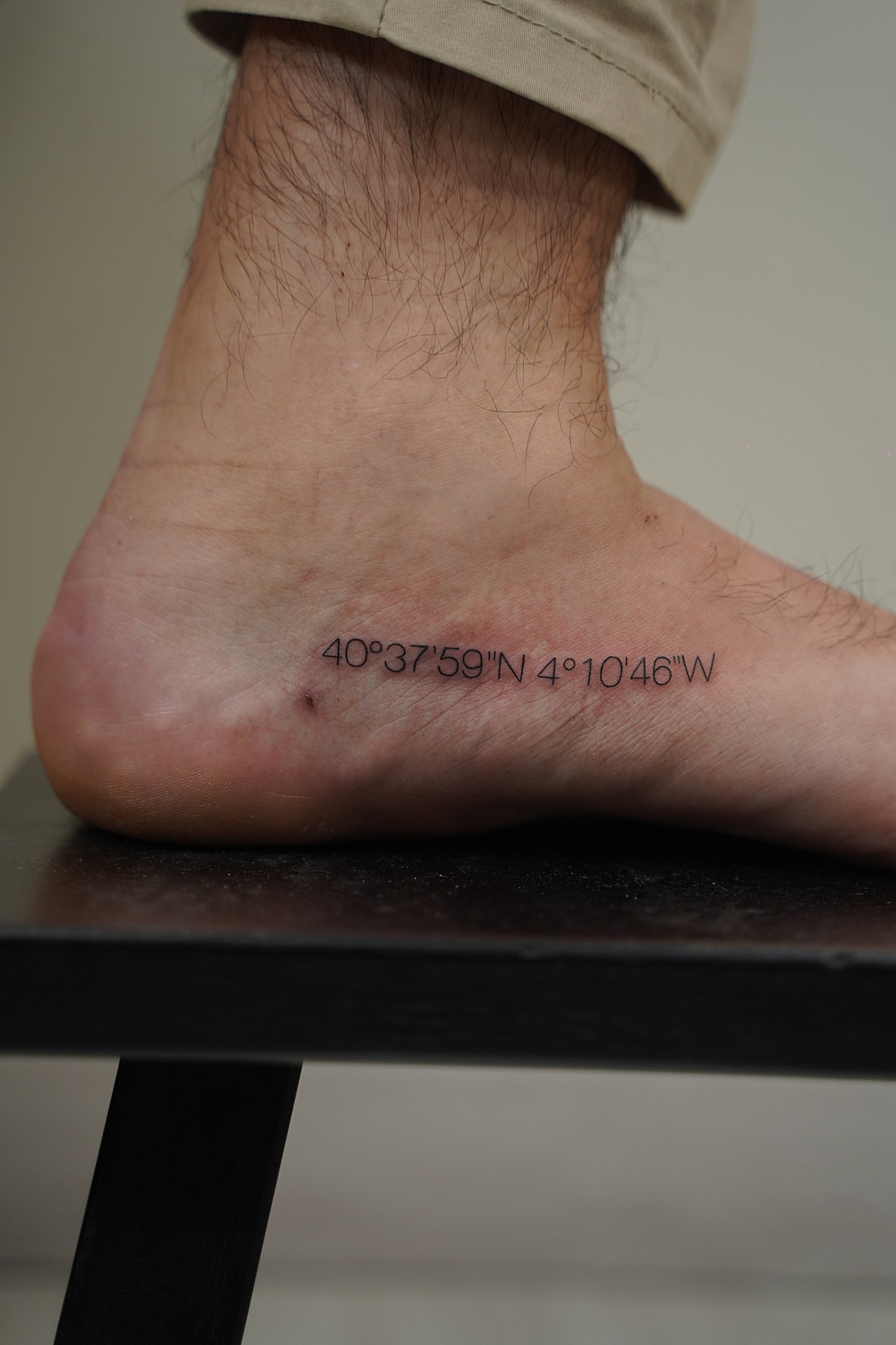 Unas coordenadas tatuadas en el pie, una zona que muchas personas eligen para su primer tatuaje. Es una ubicación delicada que requiere recomendaciones específicas de curado para asegurar que cicatrice correctamente. Las coordenadas suelen representar un lugar especial, convirtiéndose en un recuerdo permanente en la piel.