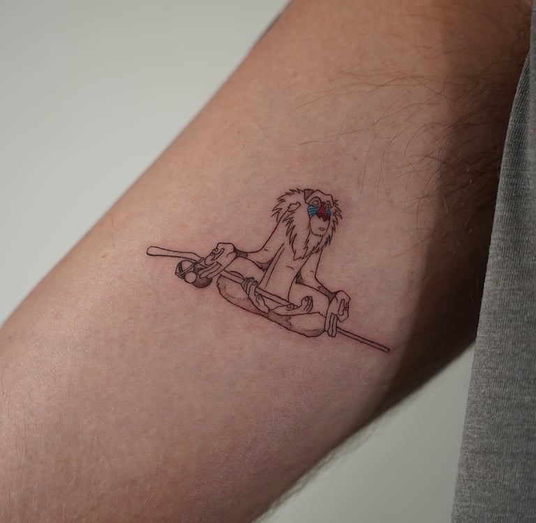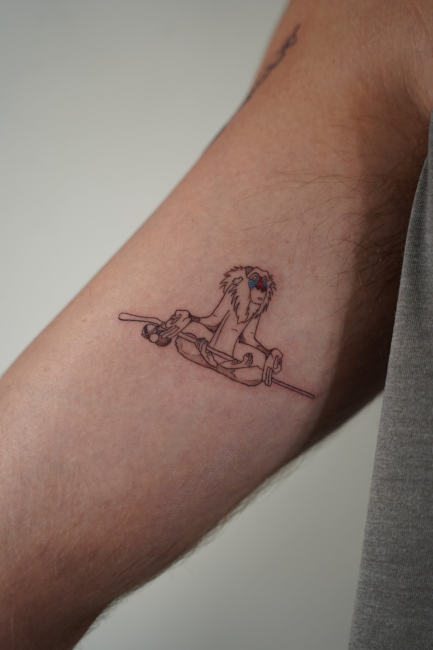 Un diseño inspirado en Rafiki, el sabio mono de El Rey León, representado en posición de meditación y trabajado principalmente en línea fina con un ligero sombreado que aporta profundidad, además de un pequeño toque de color en el rostro que lo hace aún más especial. Ubicado en la parte interna del brazo, combina simbolismo, calma y personalidad dentro de un estilo delicado pero muy expresivo.