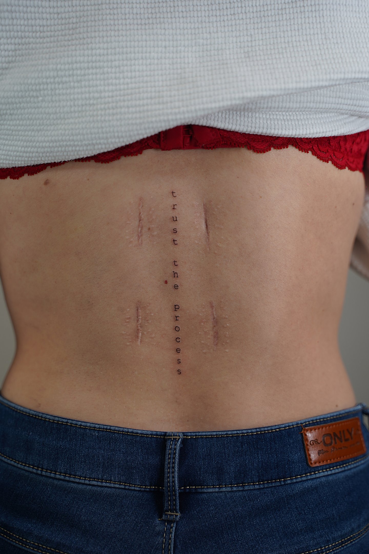 Una frase colocada a lo largo de la columna siempre genera un impacto visual fuerte y estilizado. En este caso, el diseño convive con marcas o cicatrices que forman parte de la historia personal de la persona. Sin entrar en detalles específicos, el conjunto transmite superación, resiliencia y significado profundo. Es un ejemplo de cómo el tatuaje puede integrarse en el cuerpo respetando su historia y aportando un nuevo simbolismo.