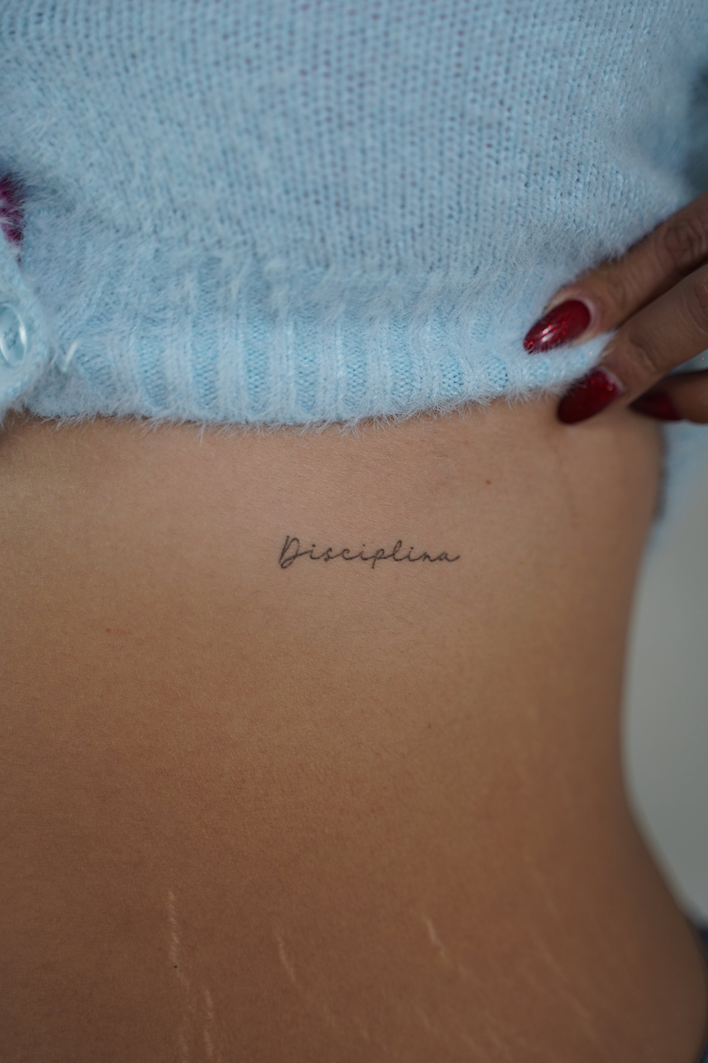 La palabra “disciplina” tatuada en las costillas, una zona que estiliza especialmente las frases horizontales. En este caso mostramos el tatuaje ya curado, donde se aprecia cómo el fineline cicatriza de forma limpia y delicada. Es un diseño minimalista pero con mucha fuerza conceptual.