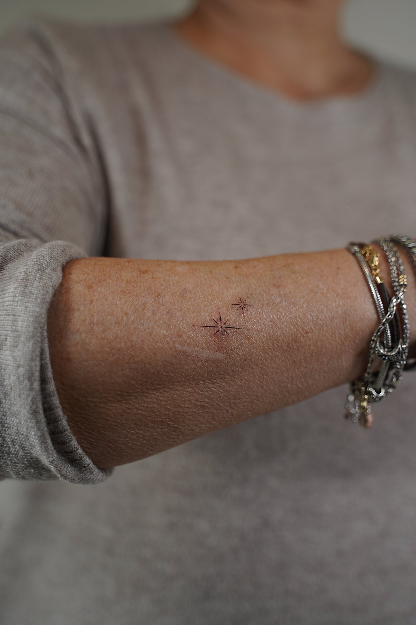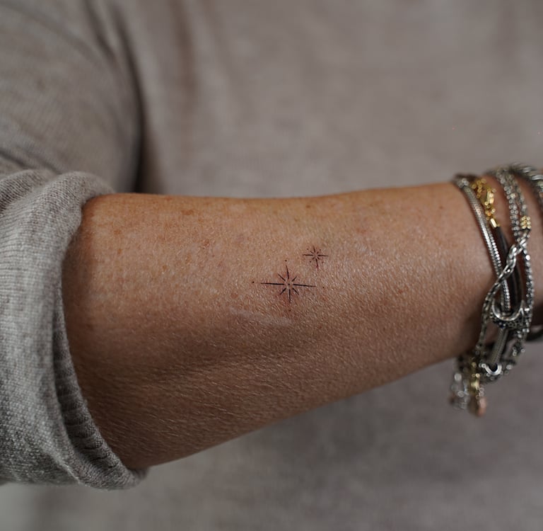 Dos pequeños destellos situados en una zona del brazo poco habitual, fuera del centro clásico. Este tipo de tatuajes fineline suelen interpretarse de manera muy personal; en muchos casos simbolizan dos hijos, el mayor y el menor. Son diseños pequeños, discretos y cargados de significado.