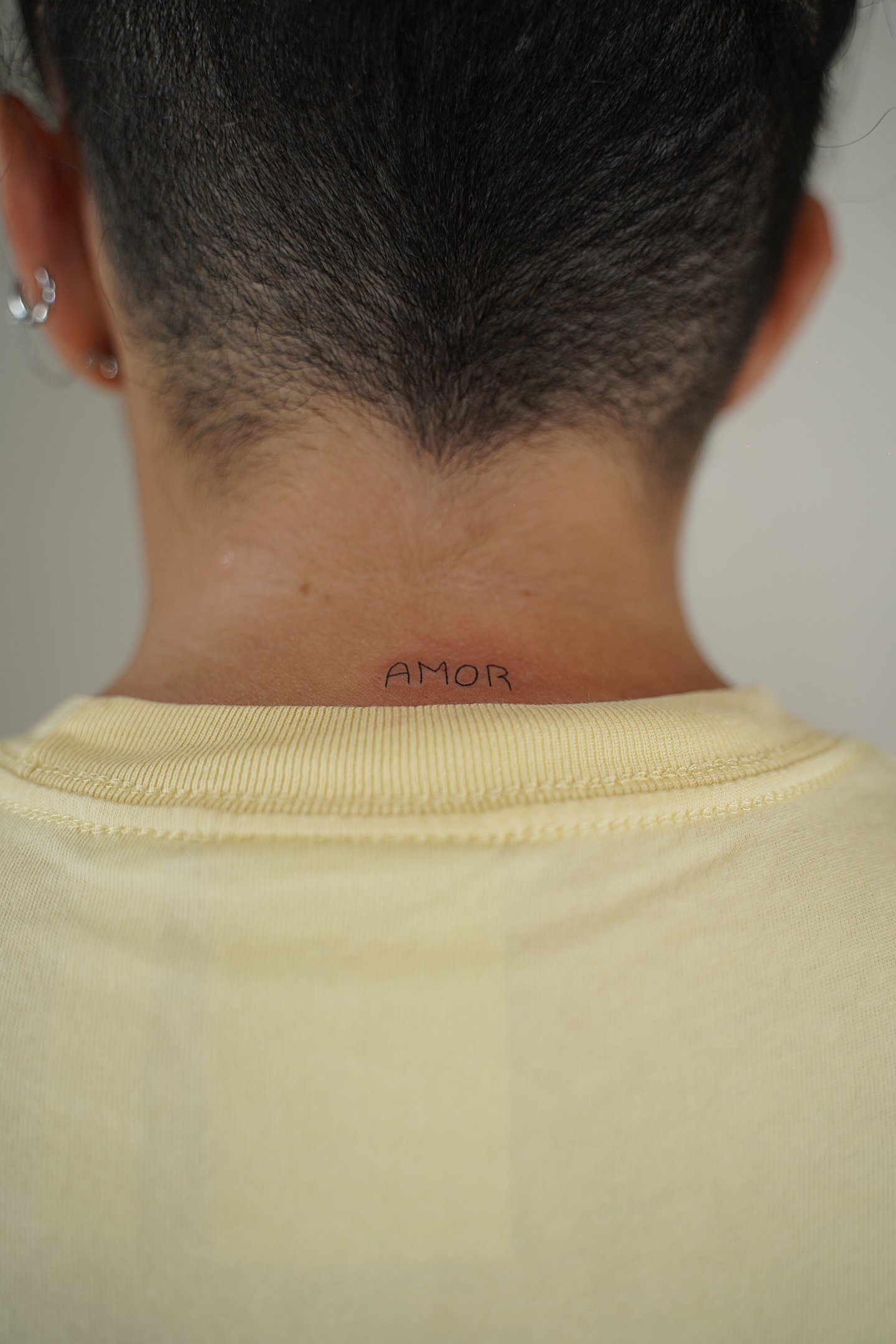 La palabra “amor” colocada estratégicamente en la nuca, justo para que se vea ligeramente por encima de la camiseta. Es un detalle pequeño pero muy bien pensado en cuanto a ubicación. Un tatuaje fineline discreto que se asoma sutilmente y aporta personalidad.