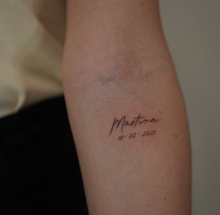 Un diseño que celebra un nacimiento de forma elegante y atemporal. El nombre “Martina” está realizado con una tipografía fina y estilizada, acompañado justo debajo por la fecha 18.02.2023 en un tamaño mucho más pequeño. La composición es horizontal, limpia y equilibrada, lo que hace que el tatuaje se vea delicado y fácil de integrar en distintas zonas del cuerpo. Una manera muy bonita de inmortalizar un momento tan especial sin recargar el diseño.