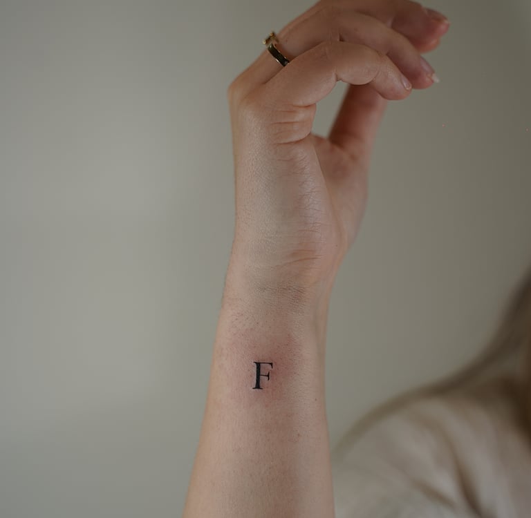 Un conjunto de iniciales —H, R, F, L y K— distribuidas de forma ligera y aparentemente aleatoria en el brazo. Cada letra representa a un familiar y, en lugar de agruparlas de manera clásica, se optó por una disposición más dinámica y divertida. El tamaño pequeño y el trazo fino hacen que el resultado sea discreto, elegante y muy personal. Una forma diferente y moderna de llevar a los tuyos siempre contigo.