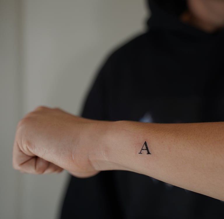 Una inicial en mayúscula realizada con tipografía estilo máquina de escribir, combinando trazos gruesos y finos que le dan carácter. En este caso, la orientación es vertical, lo que estiliza visualmente la pieza y hace que tenga más presencia en el brazo. Es un tatuaje sencillo, pero con mucha intención tanto en la elección de la letra como en su colocación.