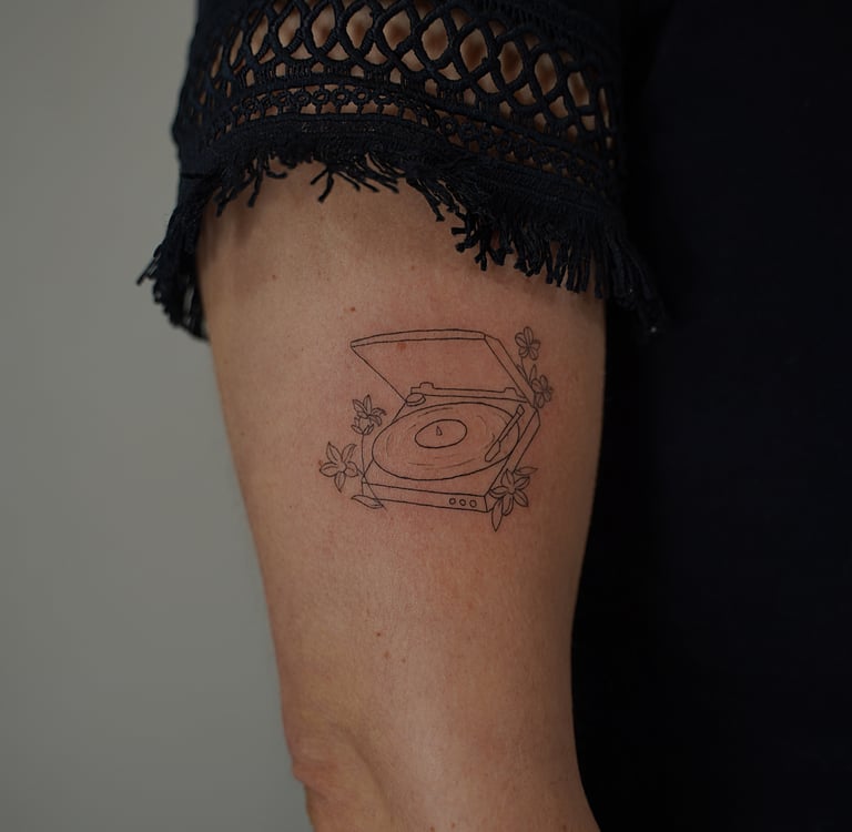 Un diseño que combina un tocadiscos clásico con elementos florales que suavizan y personalizan la composición. La ubicación en la parte externa del brazo hace que el tatuaje se adapte muy bien a la forma natural de la zona. El detalle de la flor aporta un toque característico y distintivo al conjunto, equilibrando la parte más técnica del objeto con una estética más delicada y artística.