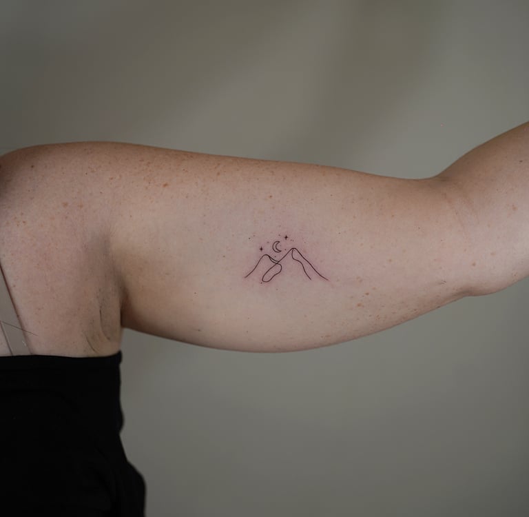 Un diseño de montañas en estilo one line acompañado de una luna y pequeñas estrellas, ubicado en la parte interna del brazo en posición horizontal. Transmite calma y conexión con la naturaleza. En este tipo de tatuajes, algunas personas prefieren girarlo 90 grados para verlo “recto” desde su propia perspectiva. En este caso, la clienta lo orientó pensando en poder disfrutarlo ella misma al mirarlo.