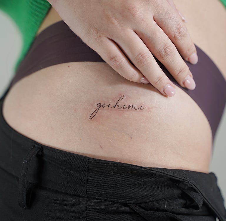 La palabra “gochimi” en tipografía cursiva y toda en minúscula, ubicada en la cadera. Esta zona funciona especialmente bien para palabras y frases delicadas, ya que estiliza y acompaña la forma natural del cuerpo. Es un diseño fino, sutil y con mucha personalidad.