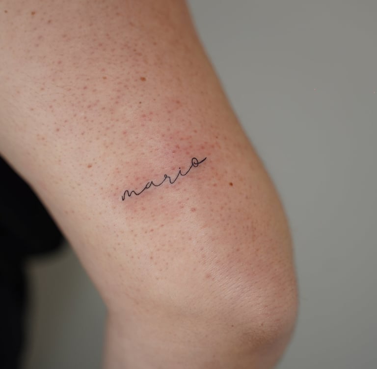 El nombre “mario”, escrito en minúsculas y en estilo cursivo, situado encima del codo. Es un tatuaje pequeño y limpio que mantiene la elegancia del trazo fino, ideal para quienes buscan un nombre con presencia sin excesos.