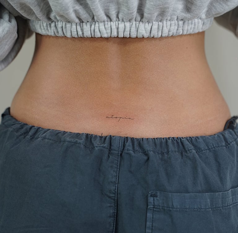 La palabra “utopía”, completamente en minúsculas, ubicada en la zona del coxis. Es una colocación elegante y delicada que funciona muy bien para palabras sutiles. Este tipo de tatuajes en la parte baja de la espalda mantienen una estética limpia y muy estilizada.