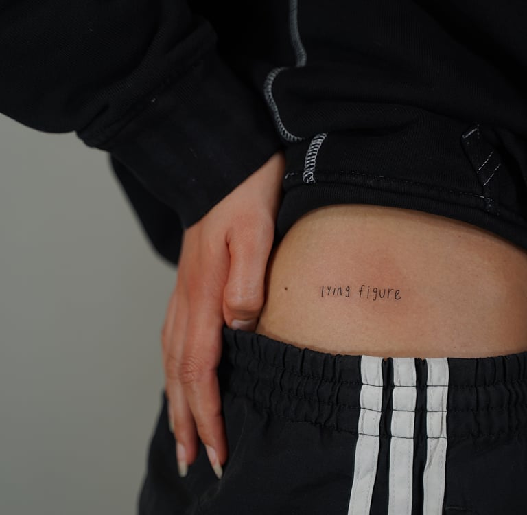 La frase “Lying Figure”, situada en la cadera, realizada con una tipografía que parece manuscrita, aunque en realidad está diseñada para mantener estructura y equilibrio. La cadera es una zona que estiliza especialmente las palabras y frases en línea fina, aportando un resultado elegante y discreto.