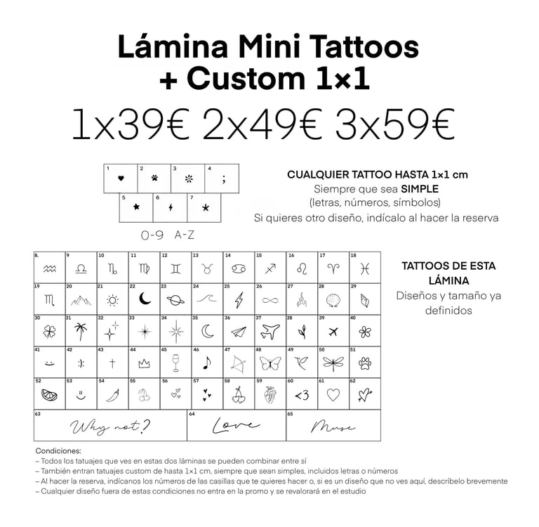 Descubre nuestros mini tattoos en Madrid. Diseños pequeños y atemporales desde 39€. Elige tu diseño de la lámina y reserva fácilmente online.