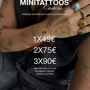 1 mini tattoo → 49€ 2 mini tattoos → 75€ 3 mini tattoos → 90€