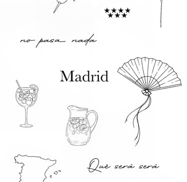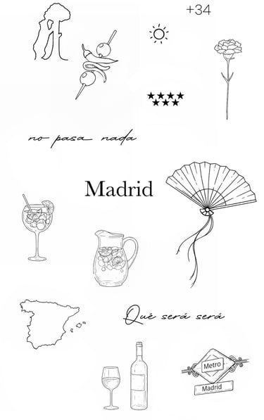 Spanish phrases "No pasa nada." "Qué será será." "+34." Short expressions that carry a whole vibe — the laid-back, warm, live-for-today spirit that makes Madrid so hard to leave.