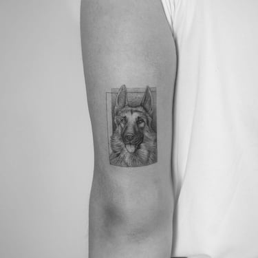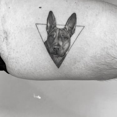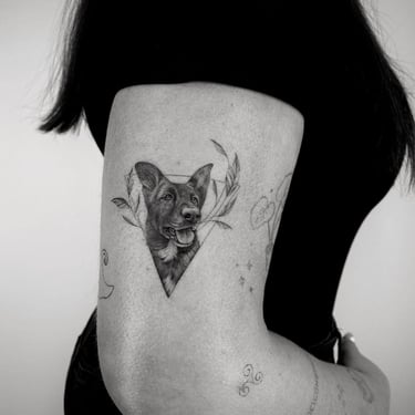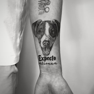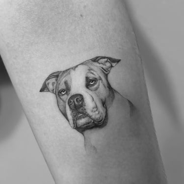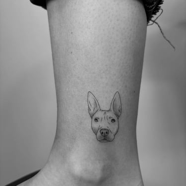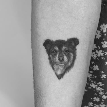Tatuajes de perros pequeños y medianos en Madrid. Diseños fine line, minimalistas y realistas llenos de significado. Especialistas en tatuajes de mascotas.